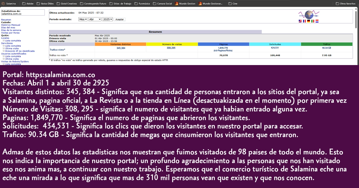 Detrás de cada clic hay una mirada curiosa, una búsqueda, una necesidad de sentir, de saber, de pertenecer. Detrás de cada visita, hay alguien —un salamineño en el extranjero, un turista enamorado del paisaje, un investigador, un joven curioso, un abuelo nostálgico— que ha decidido detenerse unos minutos en nuestro espacio digital. Cada uno ha caminado por nuestras páginas, ha leído nuestras historias, ha revivido memorias, ha descubierto la riqueza de un pueblo que resiste al olvido con belleza, con cultura y con alma.