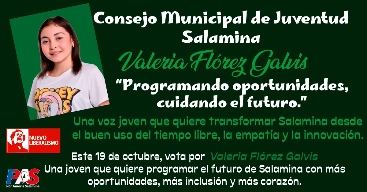 Este 19 de octubre, los salamineños tendrán una oportunidad histórica: elegir a jóvenes que no solo hablan de cambio, sino que lo viven, lo practican y lo construyen día a día. Con el respaldo de PAS y el Nuevo Liberalismo, Valeria y Víctor Manuel no son solo una opción de voto: son una apuesta por una Salamina más justa, más inclusiva y más joven.