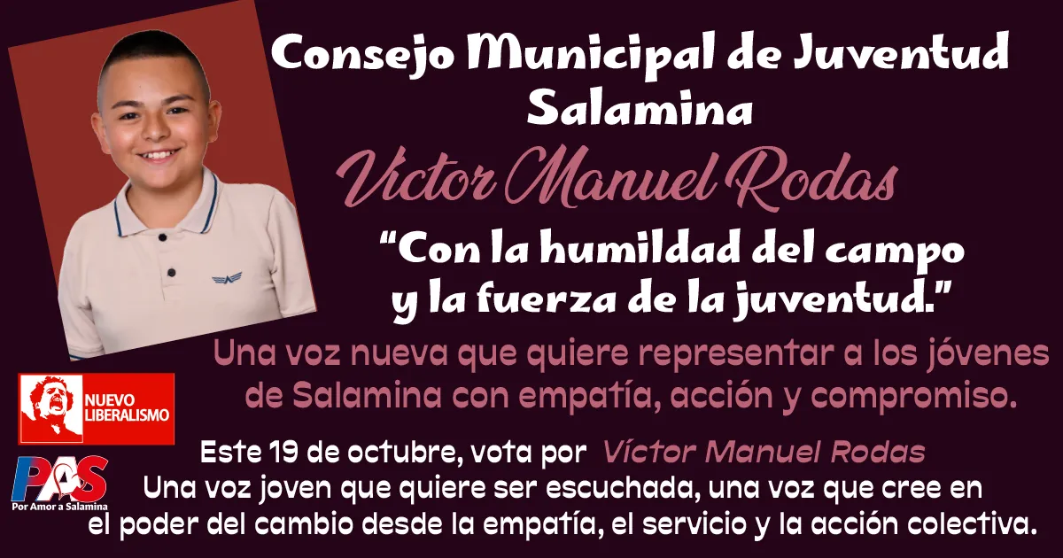 Víctor aspira a formar parte del Consejo Municipal de Juventud con un propósito claro y profundo: representar a los jóvenes de Salamina, tanto del campo como de la ciudad, y abrir caminos de participación, inclusión y desarrollo. Sueña con una Salamina donde cada joven, sin importar su origen, pueda crecer con dignidad, aprender con libertad y soñar sin límites.