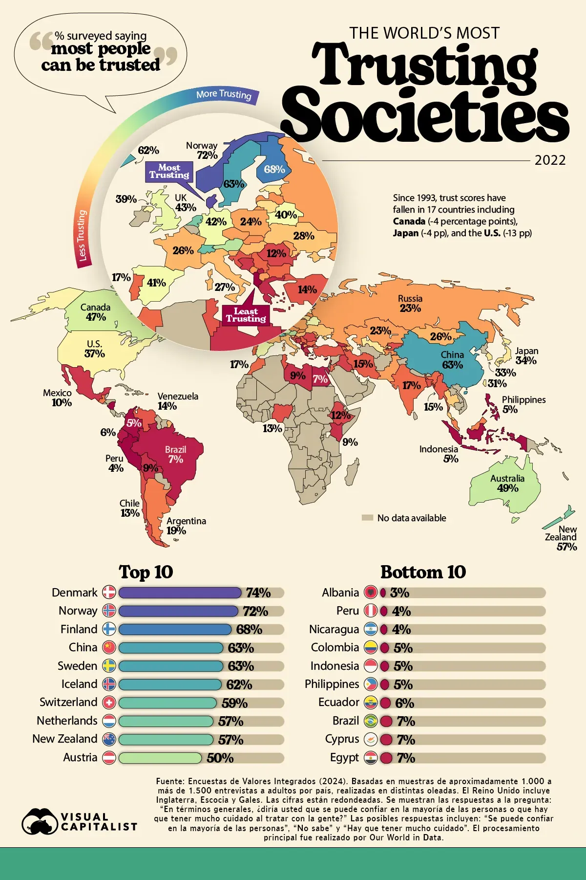 El pasado 18 de diciembre el pedagogo Julián de Zubiria publicó en la red social X los resultados de un estudio sobre las sociedades más confiables del mundo y los resultados dejan varios puntos de reflexión. En primer lugar, la diferencia entre las primeras y las últimas sociedades estudiadas es considerable y se trata de países del denominado primer mundo versus los de países en desarrollo. Por ejemplo, Dinamarca, Noruega y Finlandia registran porcentajes del 74%, 72% y 68% respectivamente como parte del top 10, mientras que Albania, Perú y Nicaragua aparecen con el 3% el primero y 4% los dos restantes, como los peor calificados. Colombia, para infortunio, hace parte del segundo grupo con solo un 5% de confianza entre la población. Ver la siguiente gráfica.