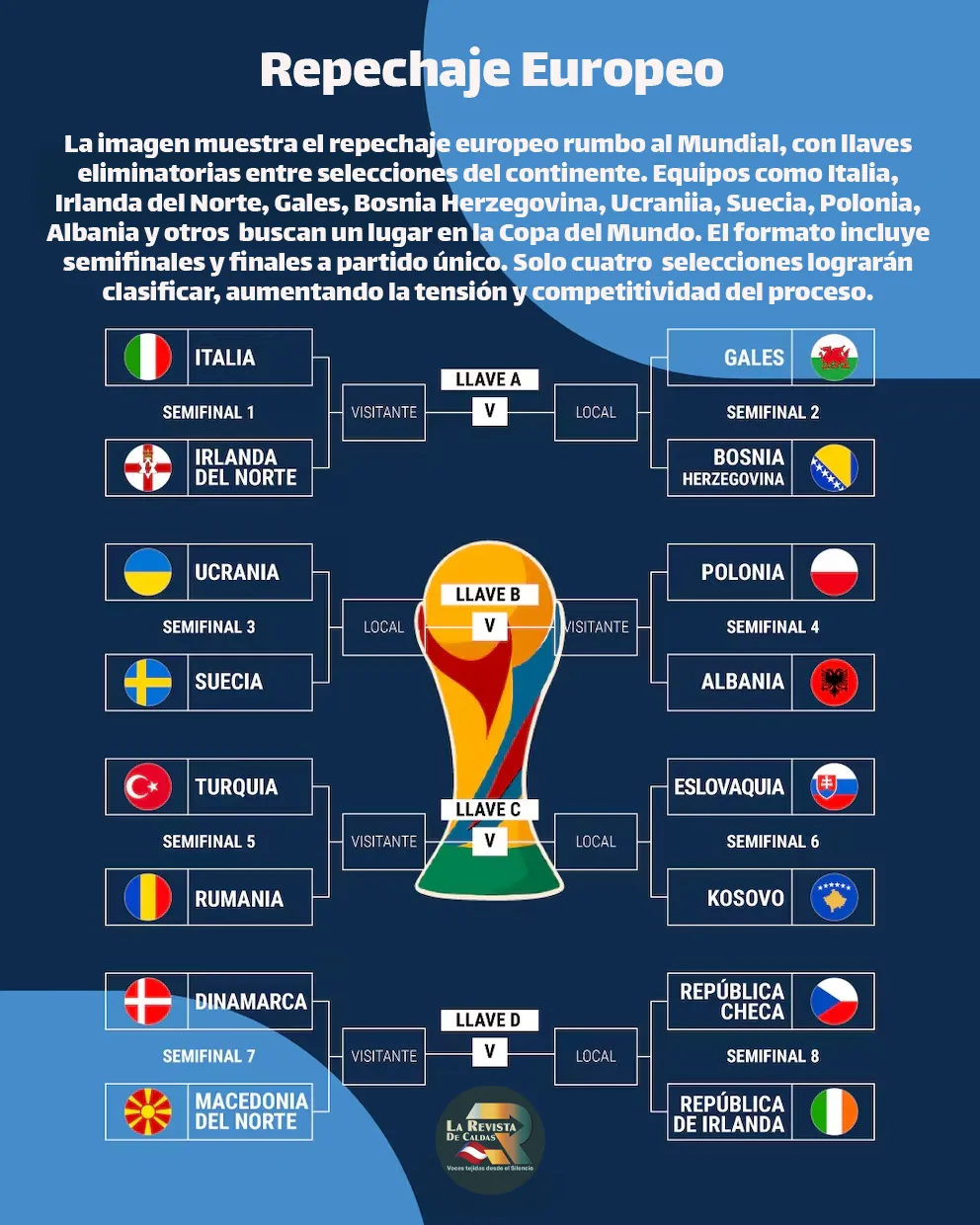 El formato europeo se organiza en cuatro llaves, cada una con semifinales y una final a partido único. De allí saldrán los últimos clasificados del continente. Equipos históricos como Italia, Polonia, Suecia o Dinamarca buscan asegurar su lugar en una instancia que no permite margen de error.