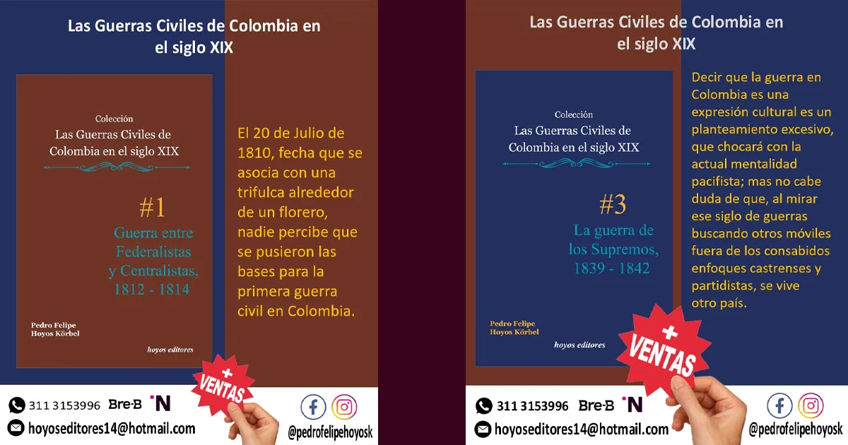 Salieron al mercado los dos primeros tomos de la colección “Guerras civiles en el siglo XIX de Colombia” de la editorial manizaleña Hoyos Editores. Con este proyecto editorial se pretende llenar un vacío en la bibliografía colombiana donde abundan libros sobre la Guerra de los Mil Días y de las demás poco se ha publicado quedando el lector interesado sin donde adquirir esa información. A cargo de la colección está el historiador Pedro Felipe Hoyos Körbel, conocido por sus investigaciones sobre arquitectura vernácula y temas regionales como el Ferrocarril de Caldas o los vitrales de la Catedral de Manizales. El plan de esta obra de 11 libros es publicar el próximo semestre otros dos tomos, complementando las primeras cuatro guerras y de ahí continuar presentando, cada 6 meses, un tomo, cerrando la colección con un diccionario de las guerras decimonónicas.